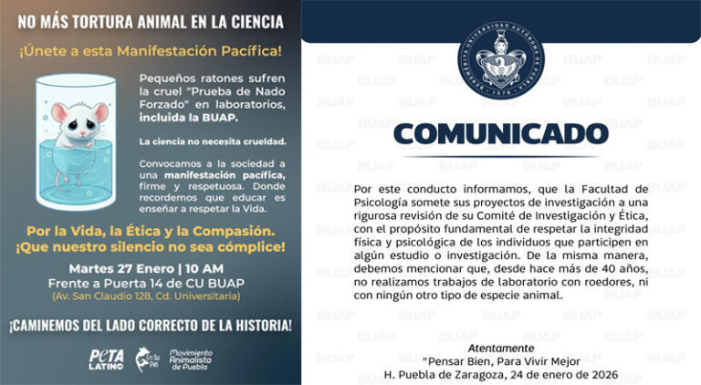 La Benemérita Universidad Autónoma de Puebla (BUAP) negó que en la Facultad de Psicología se utilicen ratones u otros animales en sus actividades académicas o de investigación, y aseguró que todas sus prácticas se apegan a un estricto código de ética. Lo anterior, luego de que las organizaciones defensoras de los derechos de los animales: … Sigue leyendo BUAP desmiente uso de animales en prácticas de la Facultad de Psicología