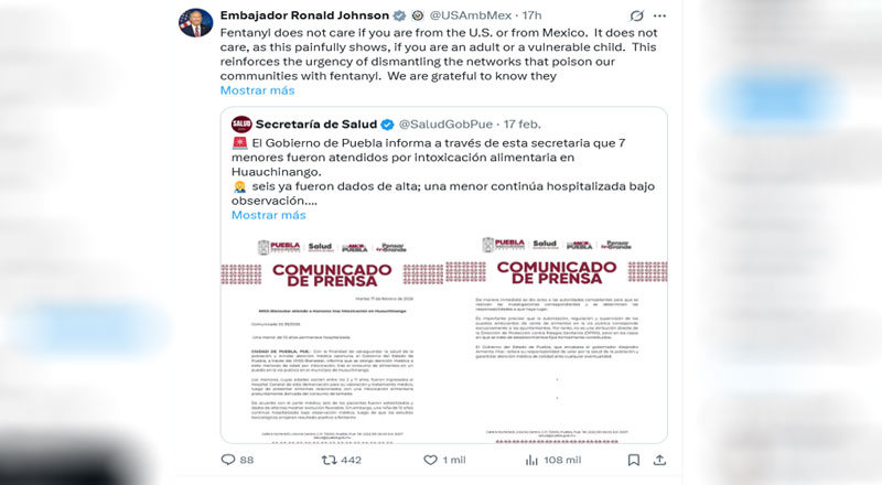 LEER NOTATras intoxicación de niños con fentanilo en Puebla, embajador de EU urge a…