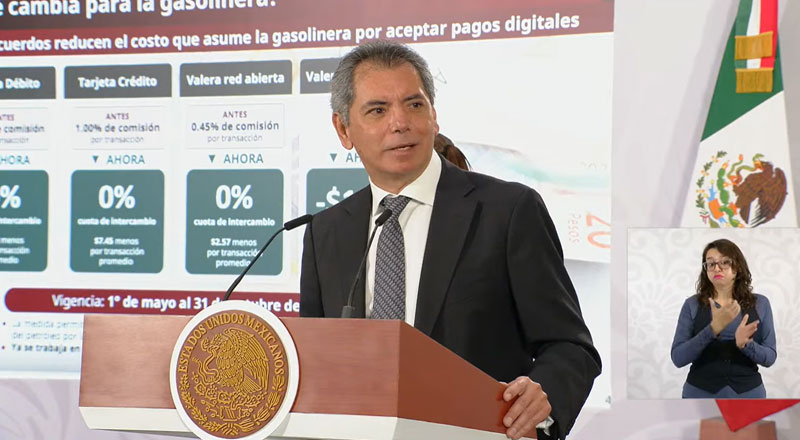 Édgar Amador Zamora, secretario de Hacienda y Crédito Publico (SHCP), anunció la eliminación total de las comisiones por transacciones bancarias en estaciones de servicio, una medida que entrará en vigor del 1 de mayo al 31 de octubre del presente año.